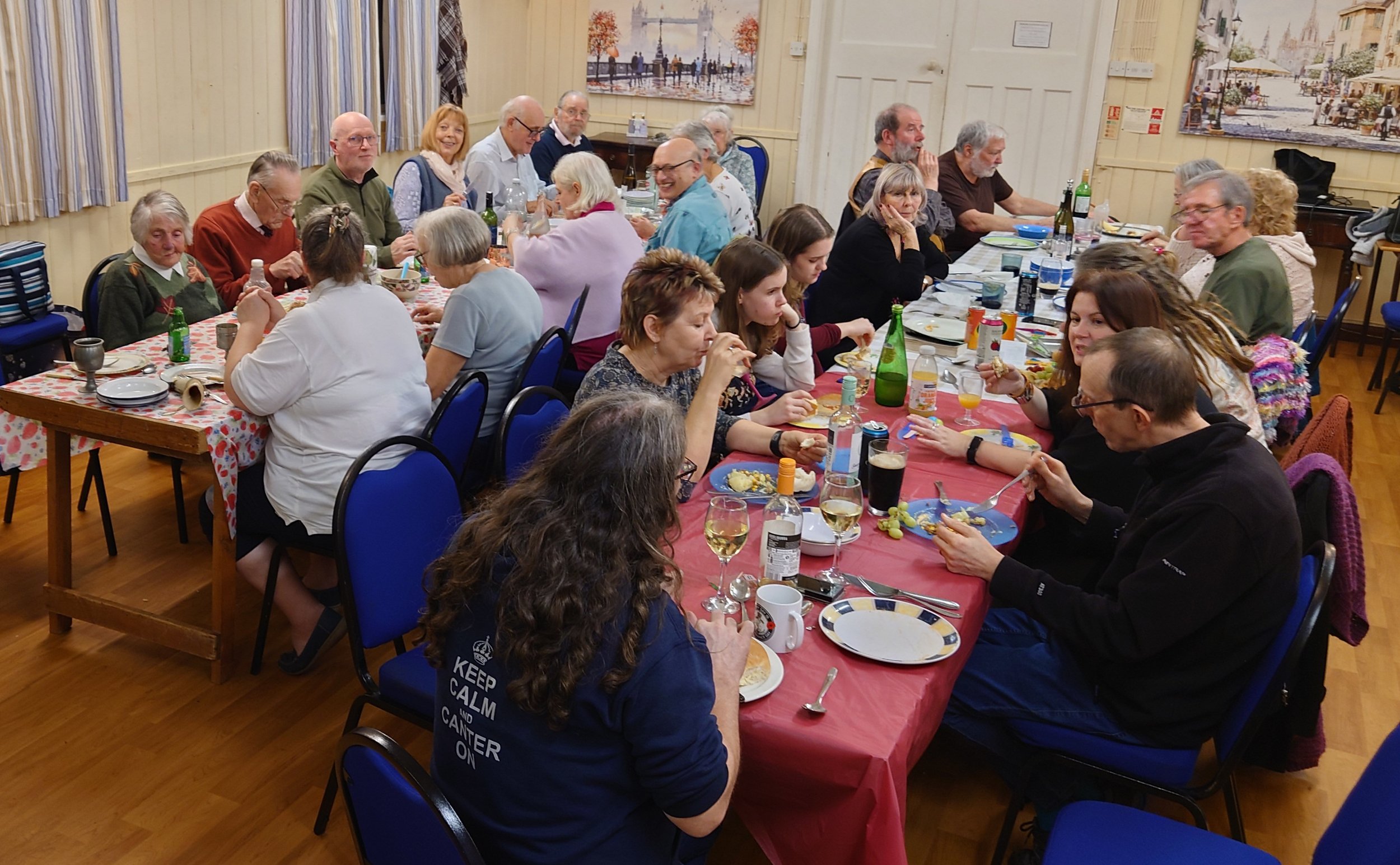The shared supper in the evening was a great success, with many thanks to those whose job it was to get out (and put back afterwards), the extra tables from beneath the stage so that we could all sit down to eat.
